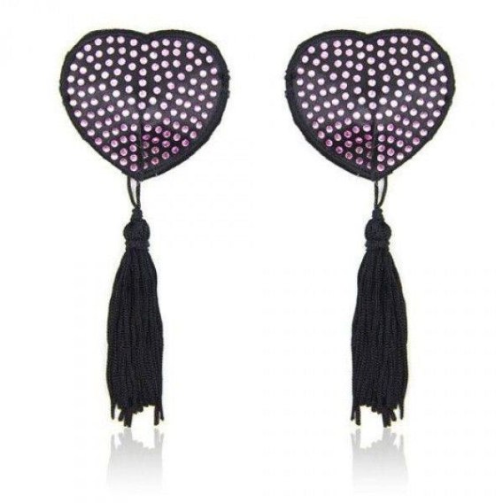 Urocze nakładki na biust w kształcie serca. Całość zdobiona jest różowymi diamencikami, a na środku przymocowano figlarny frędzelek. Nakładki są samoprzylepne, wielokrotnego użytku. W zestawie dwie sztuki.