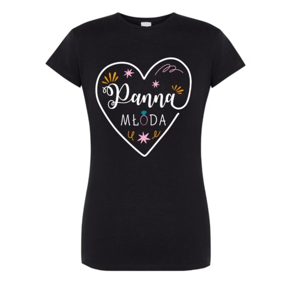 Na koszulce czarnej widnieje nadruk w kształcie serca a w nim napis " Panna Młoda " co dodaje jej stylowego wyglądu. To idealny sposób, aby przyszła Panna Młoda wyróżniała się w tłumie i czuła się wyjątkowo podczas swojego wieczoru panieńskiego.