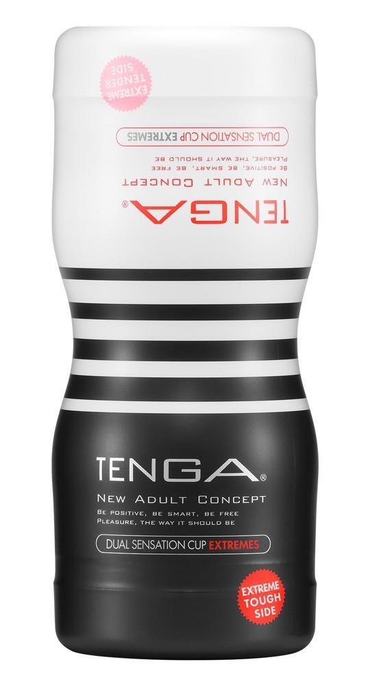 Masturbator Dual Sensation Cup Extremes od Tengi w dyskretnym kubku z ekscytująco ustrukturyzowanymi kanałami przyjemności, które skręcają się i przeplatają dla unikalnych, intensywnych doznań. Extreme Tender Side (biały) rozpieszcza łagodnie i delikatnie, Extreme Tough Side (czarny) stymuluje mocno i chwytliwie.