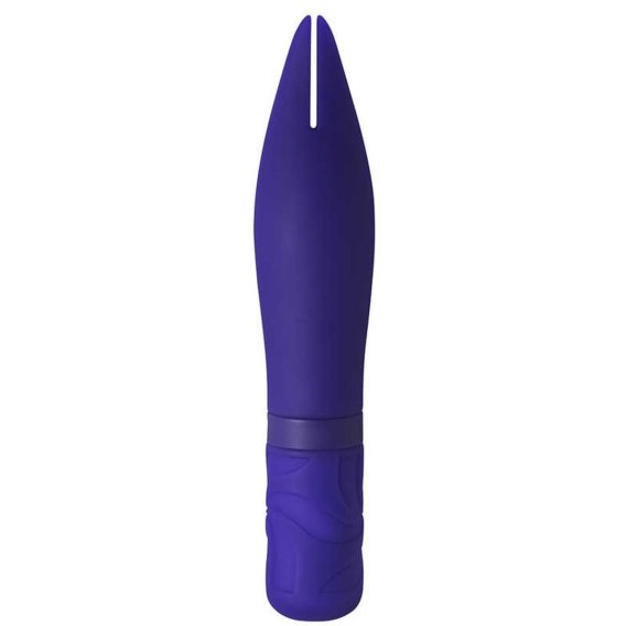 Miniwibrator ma piękny kobaltowy kolor obudowy, który nadaje modelowi wyjątkowy wygląd. Stymulator wibracji ma ciekawy kształt głowy, przypominający rozwidlony grot. Za pomocą tego rodzaju „widelca" można uszczypnąć łechtaczkę, wargi sromowe, a nawet sutki piersi, aby zmaksymalizować koncentrację wibracji w strefie erogennej. Zabawka nadaje się do penetracji pochwy, gdzie można również stymulować poszczególne wrażliwe obszary. Urządzenie wyposażone jest w doskonały moduł wibracji z 10 zaprogramowanymi trybami. Do sterowania służy przycisk znajdujący się u podstawy uchwytu. Do zasilania służy wbudowany akumulator. Długość 15,2 cm, średnica 3 cm.