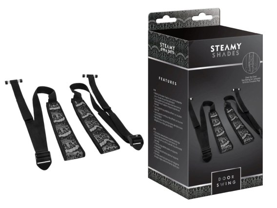 Seks huśtawka wisi bezpiecznie nad każdymi standardowymi drzwiami, solidne sztangi utrzymują huśtawkę na miejscu nad każdymi zamkniętymi drzwiami, regulowane paski zapewniają optymalne wsparcie, wyściełane paski zapewniają wygodne wsparcie, paski na nogi mają elegancką, przezroczystą, czarną koronkową nakładkę na lśniącej szarej tkaninie. Huśtawka (100% poliester) paski (100% polipropylen) Regulatory (100% plastik ABS) Haczyki (100% Akryl)