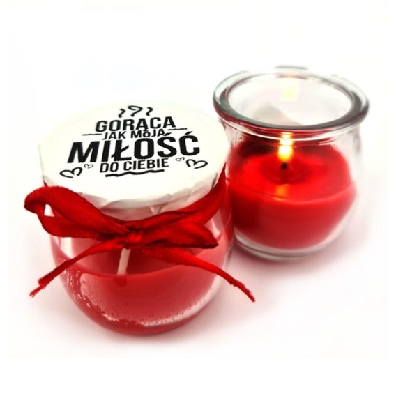 Świeczka zapachowa w ozdobnej serwetce papierowej z napisem Gorąca jak moja miłość do Ciebie.