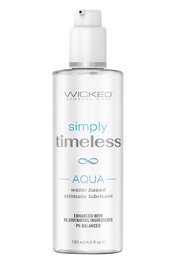 Timeless Aqua is a silky water based lube that provides a smooth, long lasting glide with extra hydration.Menopause and aging can bring about change to our bodies, but our right to prioritize pleasure remains constant. The Timeless collection by Wicked gives people different options based on individual needs and preferences, and each formula has been carefully crafted using the most innovative and rejuvenation ingredients. The Timeless collection is free from glycerin, parabens and propylene glycol. Each formula can be used as a daily vaginal moisturizer.Unique supportive ingredients provide extra moisture and hydration.Featuring expanded labels with enlarged font for easy to read consumer information and support.Vegan and cruelty free.  Supportive ingredients: Aloe leaf juice, Squalane, Vitamin E, Olive leaf extract, Sodium hyaluronate.